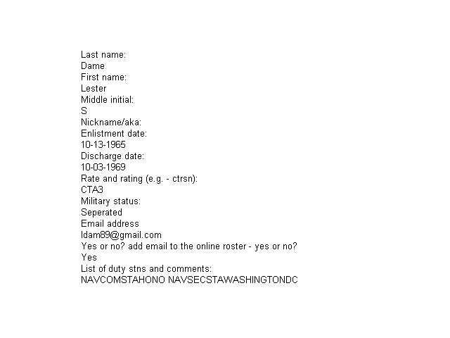 | Daly, Thomas F. | Tom | CTI2 | Apr 1970 | - | - | May 1974 | USNR - Clifton, NJ 1976-81 CTI1 | |