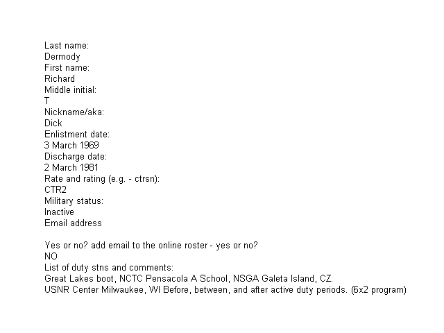 | Dermody, Richard T. | Dick | CTR2 | Mar 1969 | - | - | Mar 1981 | No-Email | - |