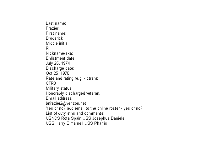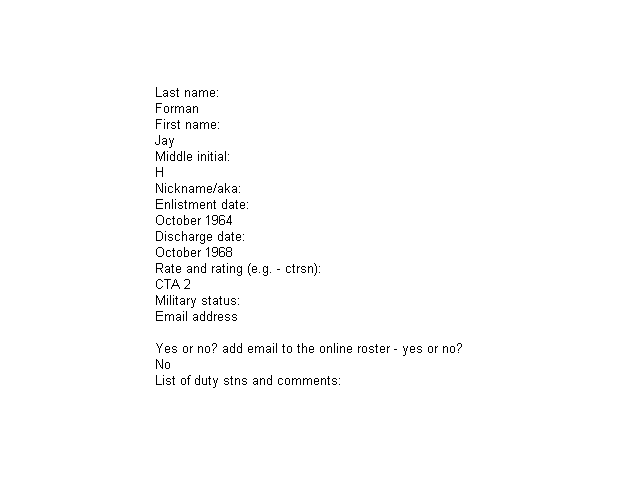 | Fleetwood Jr, James V. | - | CTT2 | ~1964 | - | - | 1973 | R.I.P. | July 12, 2004 |