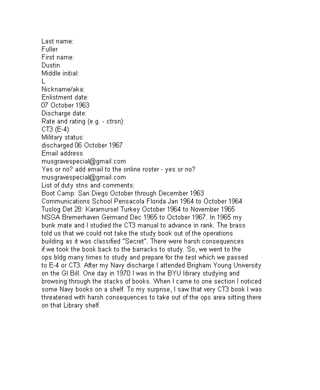 | Fuller, Edward G. | - | CT3 | ~1959 | - | - | Unk | R.I.P. | July 26, 2018 |