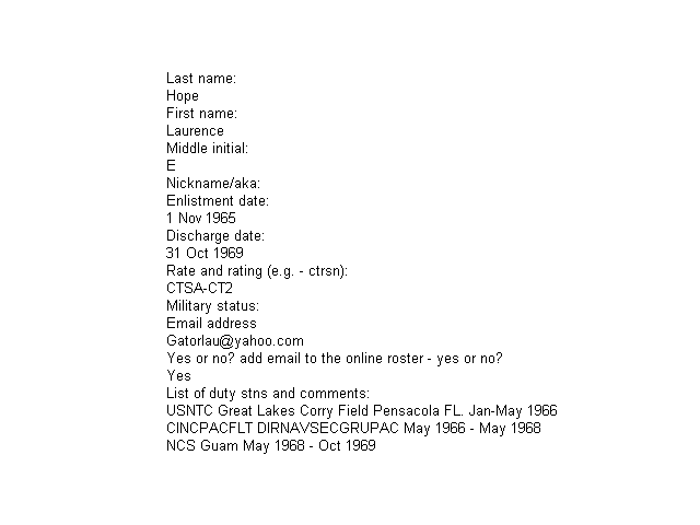 | NAME | Nickname | Rank/Rate | Enlisted | Flt Res | Full Ret | Separated | Remarks | |
