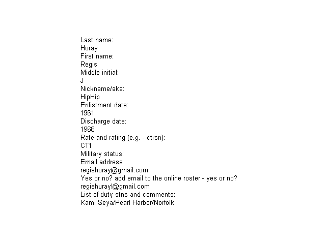 | Husvar Jr, James R. | Jim | CTR3 | Oct 1969 | - | - | Aug 1973 | R.I.P. | October 18, 2010 |