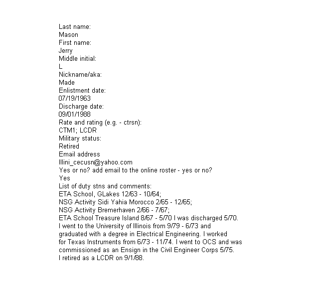 | Mayo, David Glenn | - | CTOSN | Sep 1969 | - | - | Jun 1972 | R.I.P. | November 24, 2009 |