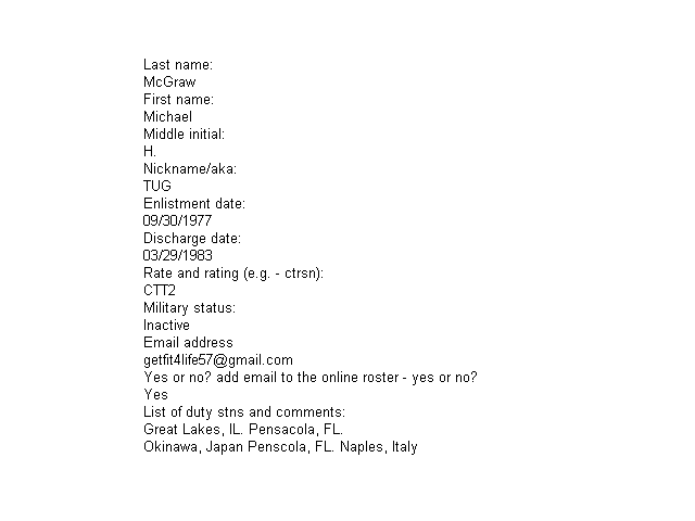 | McRae, Robert R. | Rob, Gonzo | YNCS(SW) | Jul 1988 | - | - | - | Still on Active Duty former CTACS(SW) |