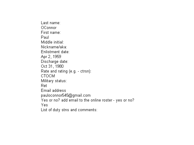 | OConnor, Steve | - | CTT1(SS) | Sep 1978 | Oct 1998 | - | - | No-Email | - |