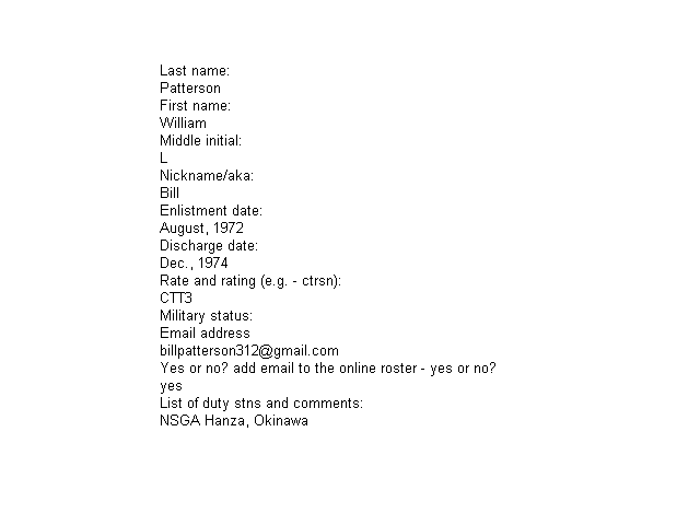 | Peterson, Lee S. | Pete | RMCS(SW) | Dec 1966 | May 1993 | Dec 1996 | - | NSGA Support Adak 77-81 | |
