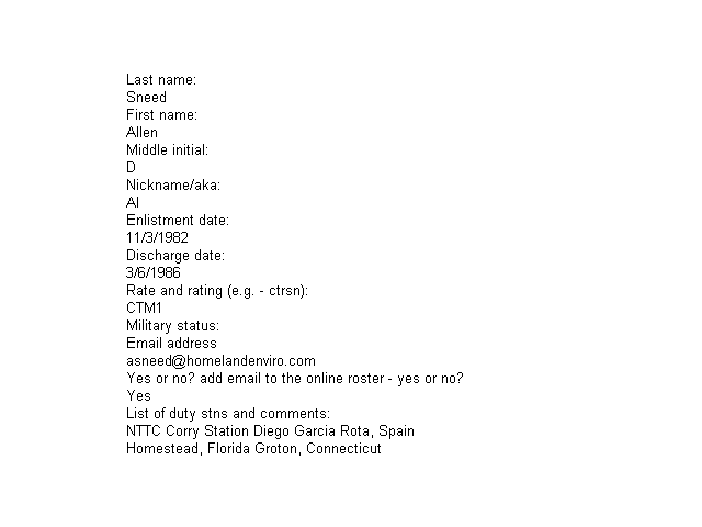 | Springer, Richard | Rick | CTR1 | Nov 1967 | - | - | Nov 1971 | USN 67-71/USNR 71-89 | |