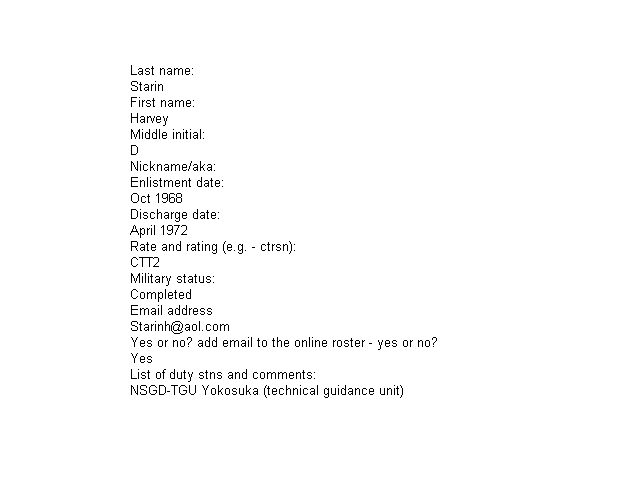 | Starin, Harvey D. | - | CTT2 | Oct 1968 | - | - | Apr 1972 | - | |
