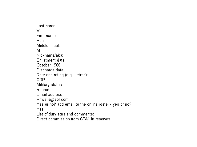 Valle, Paul Michael | - | CDR | Oct 1966 | - | Unk | - | former CTA1 USNR | |