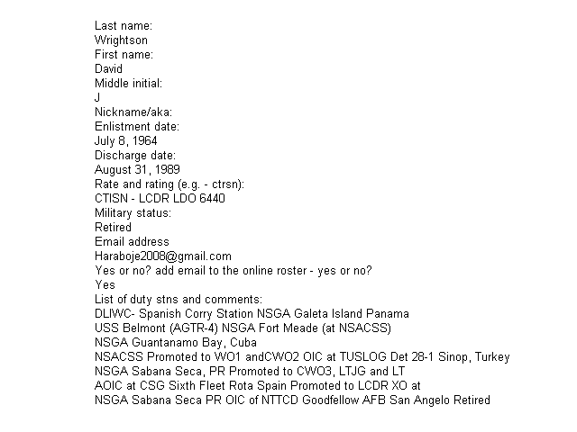 | Wrightson, David J. | - | LCDR | Jul 1964 | Aug 1989 | - | - | CTISN - LCDR LDO 6440 | |