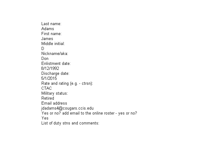 Allen, James R. | Jay | CTO2 | Mar 1970 | - | - | Sep 1979 | No-Email | - |