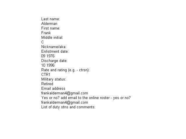 Allison, Cathy A. | - | CTT2 | May 1979 | Jan 1992 | - | - | No-Email | Cathy A. (Loper) Allison Aug of 88 TDRL - Jan of 92 PDRL |
