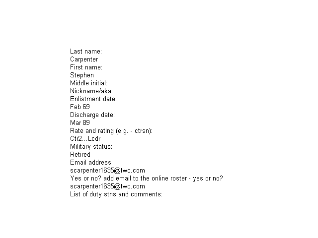 | NAME | Nickname | Rank/Rate | Enlisted | Flt Res | Full Ret | Separated | Remarks | |