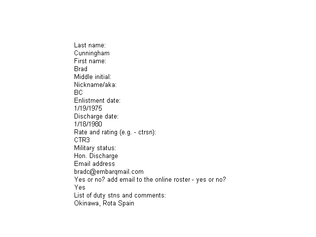 | Cutler, Steve | - | CTT1 | Jan 1978 | - | - | Jan 1984 | No-Email | USNR Jan 82-Jan 84 |