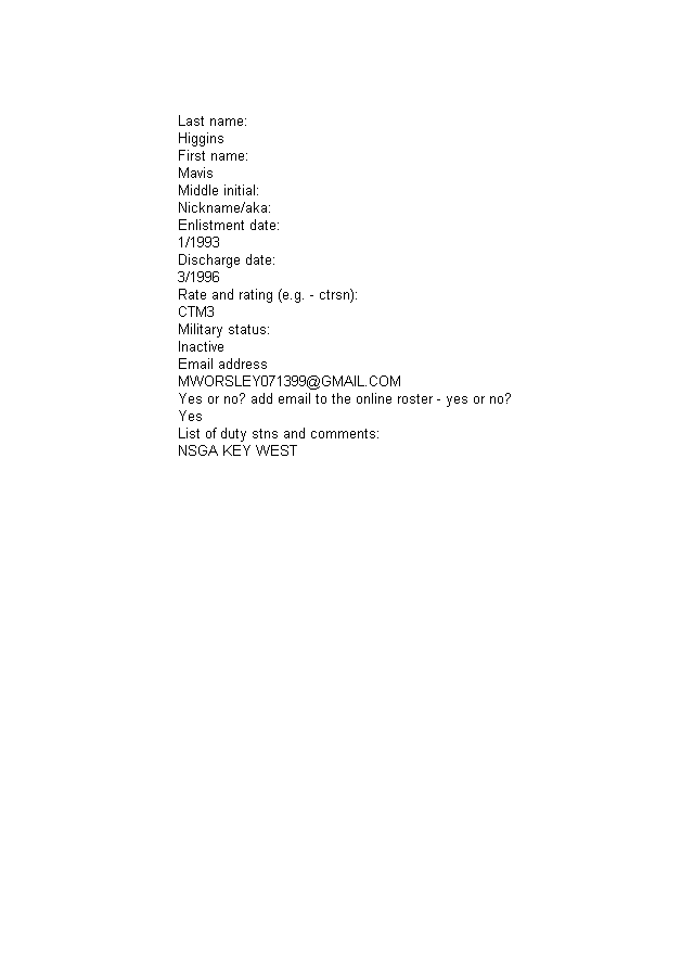 | NAME | Nickname | Rank/Rate | Enlisted | Flt Res | Full Ret | Separated | Remarks | |