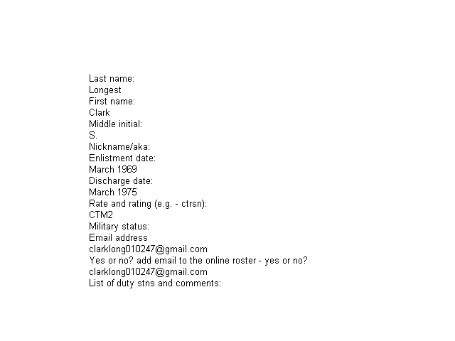 | Linder, Charles Kenneth | - | CTSN | ~1952 | - | - | Unk | R.I.P. | February 10, 2009 |