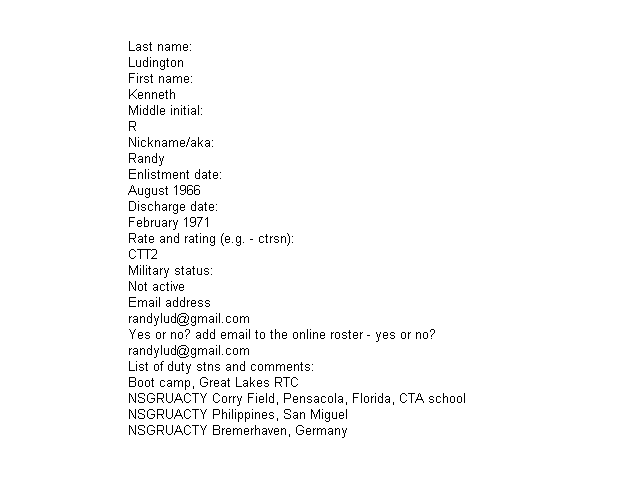 | Lijewski, Robert Edward | - | CTR1 | May 1973 | Jun 1996 | - | - | former CTT. USNR 73-96 | |