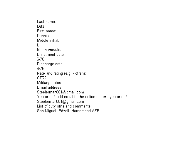 | Lutz, Donald Lee | - | CT2 | ~1948 | - | - | Unk | R.I.P. | October 7, 2020 |