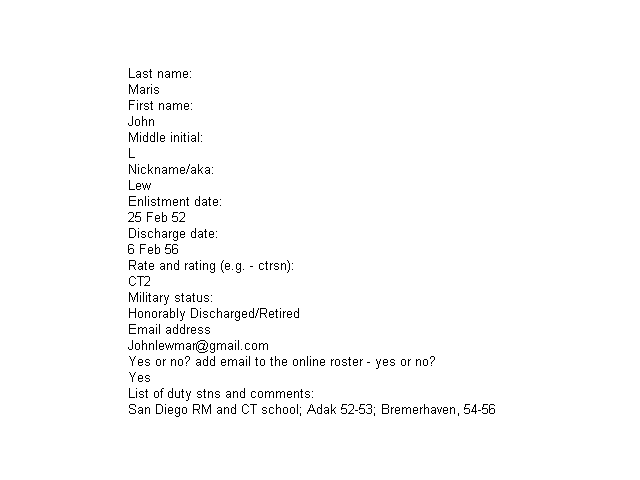 | Maxfield, Charles Gilbert | - | CTSN | ~1958 | - | - | Unk | R.I.P. | April 27, 2024 |