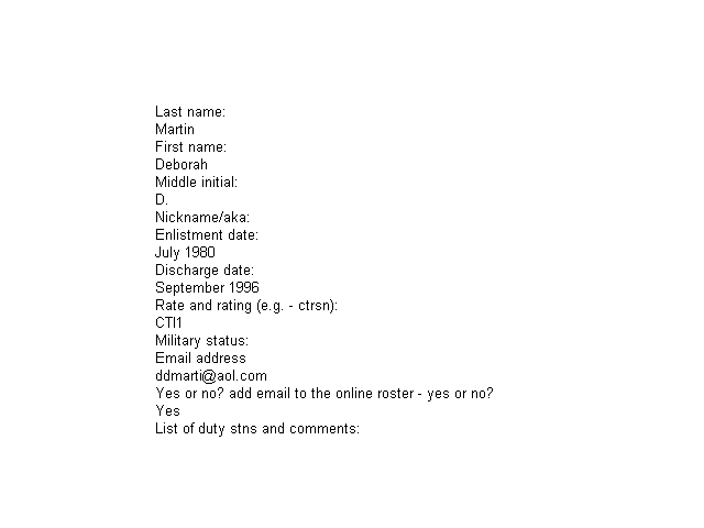 | Mack, Tristan L. | T. Mack | CTA1 | Sep 1989 | - | - | Sep 1997 | No-Email | Reserve(USNR) CTN1/CTA1 |