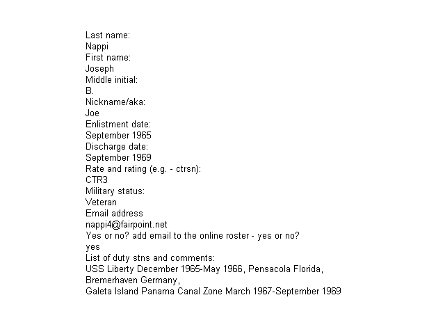 | Nappi, Joseph B. | Joe | CTR3 | Sep 1965 | Sep 1969 | - | - | - | |