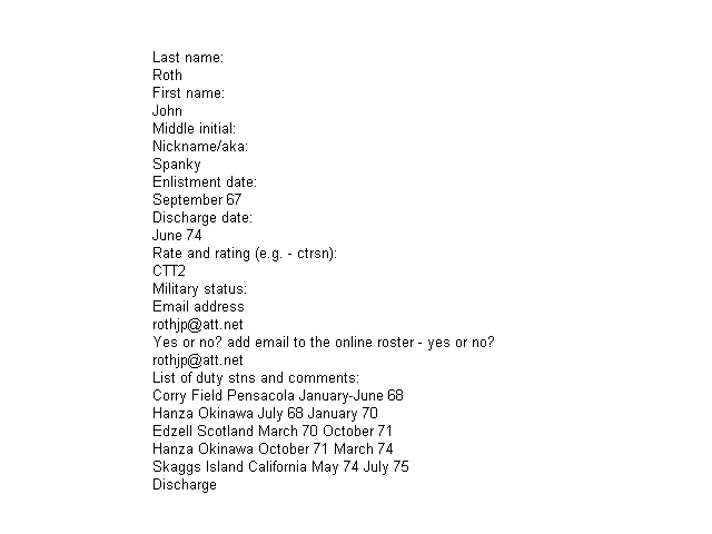 | Roberts, Lyle M. | - | CTA2 | ~1965 | - | - | Unk | R.I.P. | September 2, 2002 |