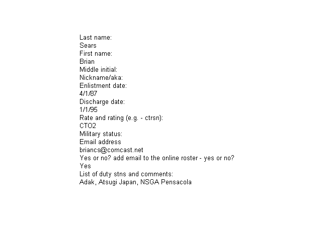 | Samuels, Gregory T. | Greg | YNCS(AW/SW) | Aug 1985 | Aug 2011 | - | - | No-Email | former CTAC(SW) |