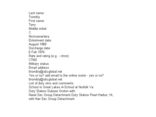 | Timm, Dennis A. | - | CTA3 | 1966 | - | - | Oct 1971 | No-Email | USNR |
