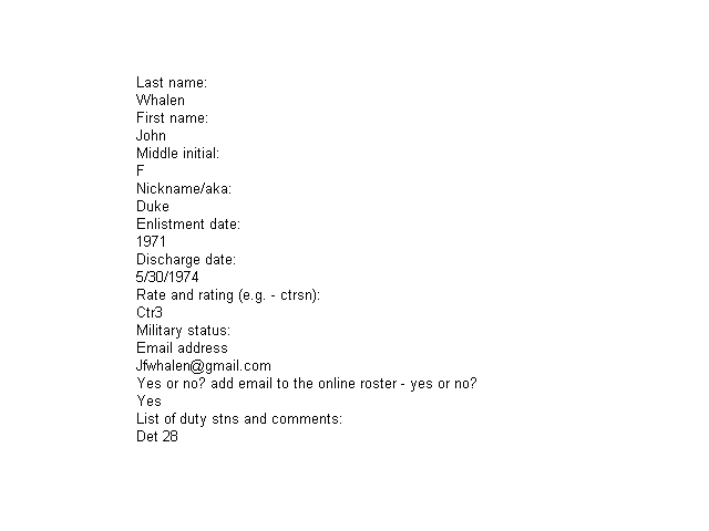 | Wakeen, David Thomas | Jim | CWO4 | 1956 | - | 1984 | - | R.I.P. | August 28, 2015 |
