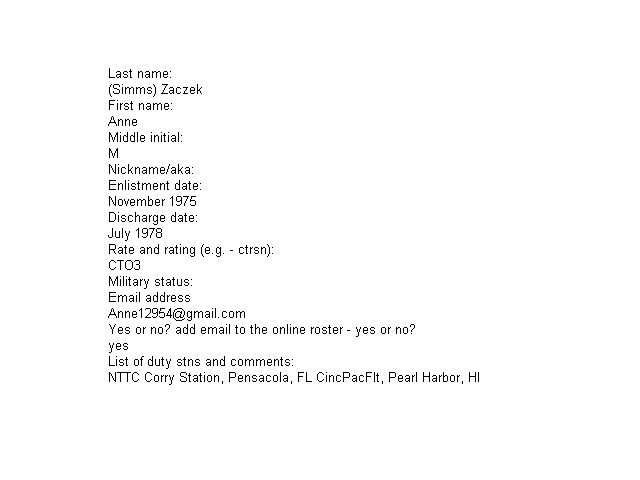 | Zoerner, Brian C. | - | CTT2 | 1979 | - | - | 1984 | No-Email | - |